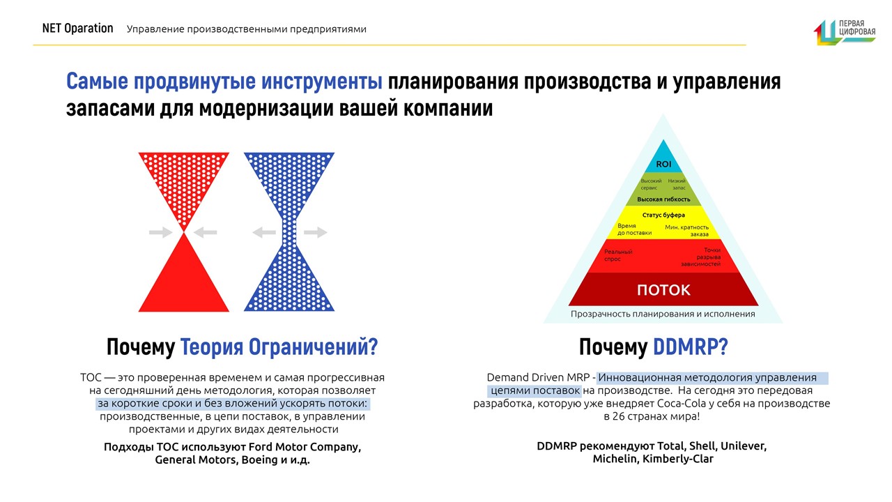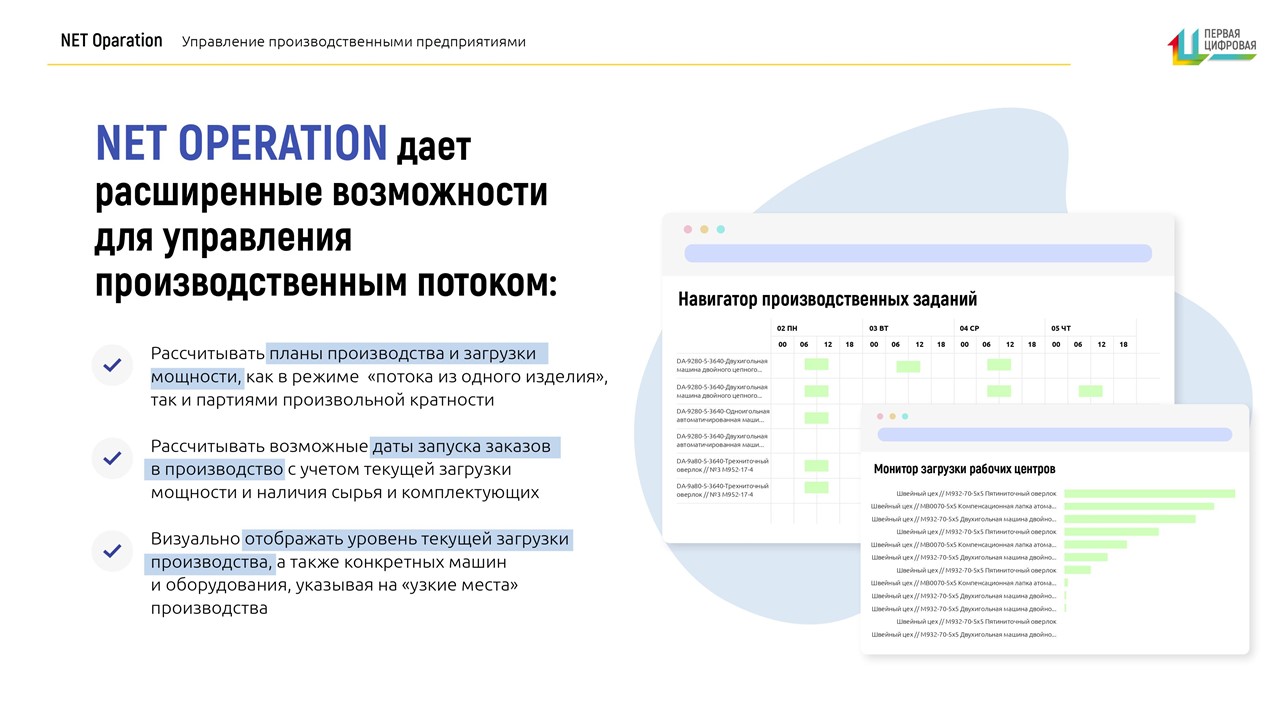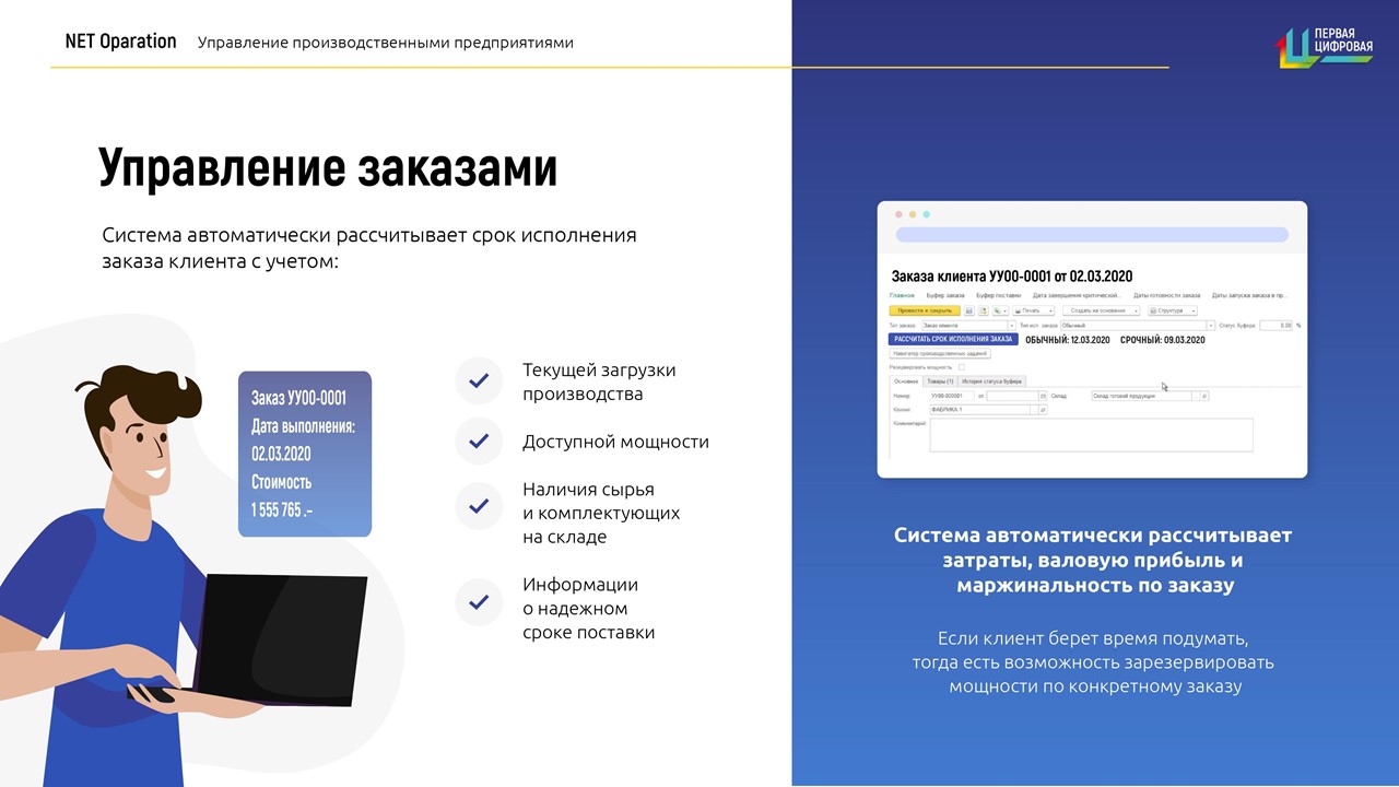 Net Operation выгодно отличается от других традиционных систем тем, что управление производством основано на своевременном удовлетворении потребностей клиентов по самому оптимальному для компании сценарию